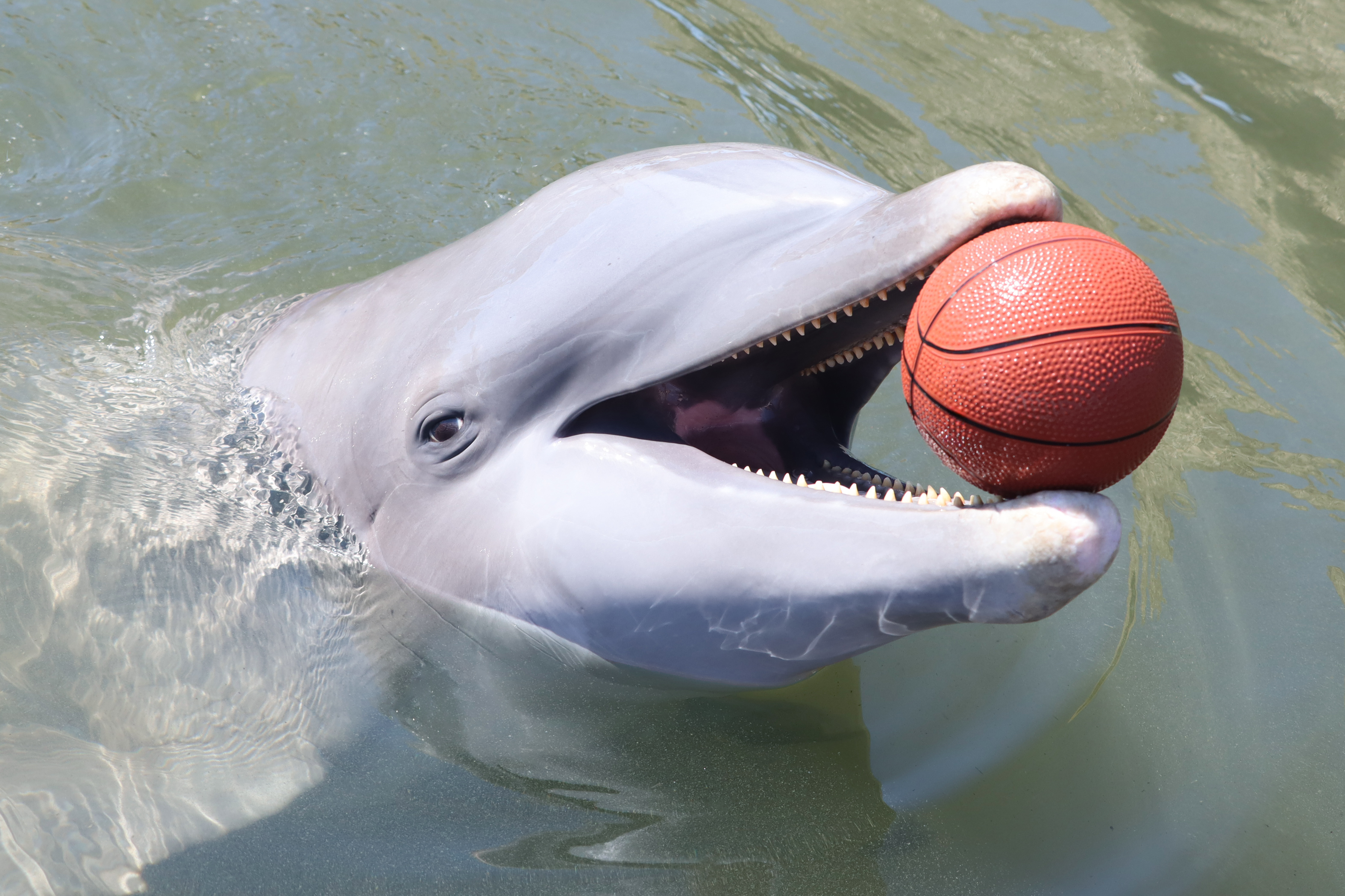 Flagler is learning a fun ball kick where he will go and hit a ball with his tail! So far, he is swimming right next to the ball and flicking his tail, but he is starting to get the idea.